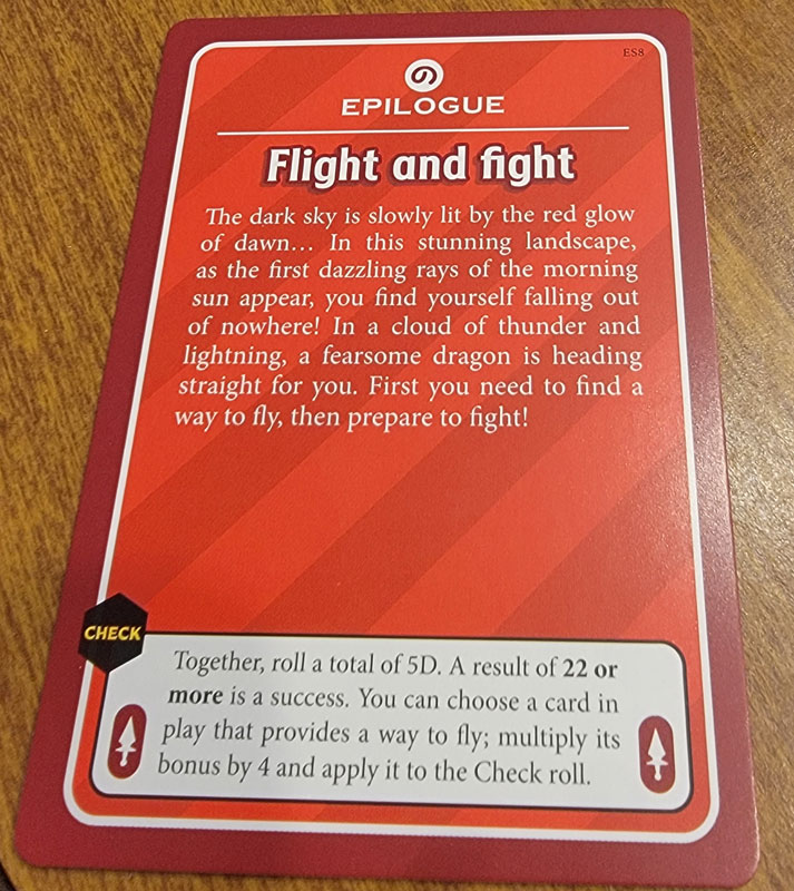 - After three times around the table, the GM draws an Epilogue card and reads it aloud. The group combines their powers and accumulated cards and hopefully succeeds in the final challenge.